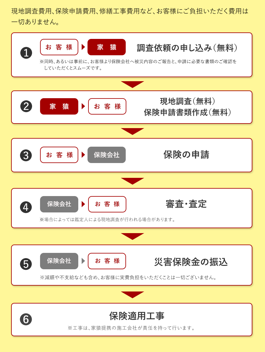 - 現地調査費用・保険申請サポート費用・鑑定人立ち会い費用のお客様負担は一切ございません。